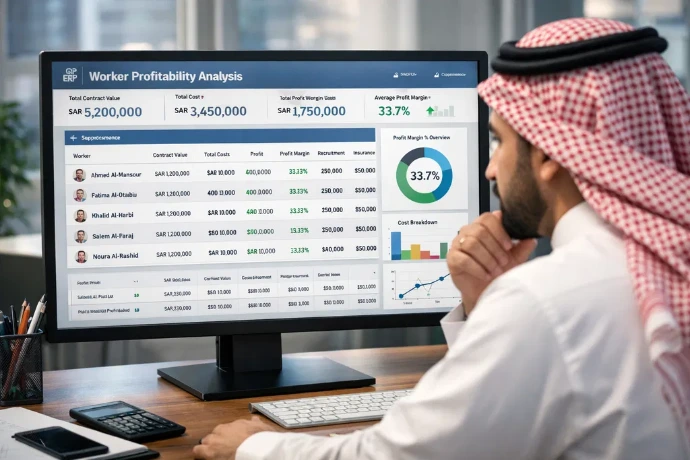 هذه ليست مجرد لوحة بيانات، بل هو محرك مالي متطور يقوم بحساب تكلفة الاستقدام، الرواتب، التأمين الطبي، رسوم الإقامة، تكاليف السكن والنقل، ثم يقارنها بالإيرادات من العقود.